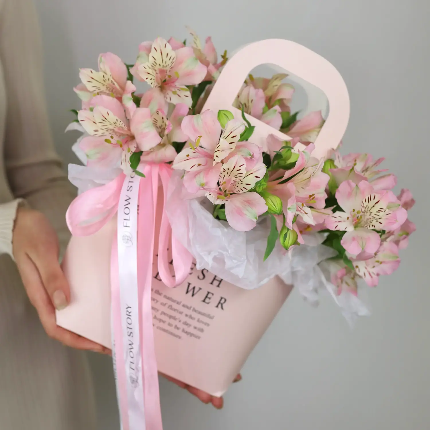 Композиция в картонной сумке из розовых альстромерий