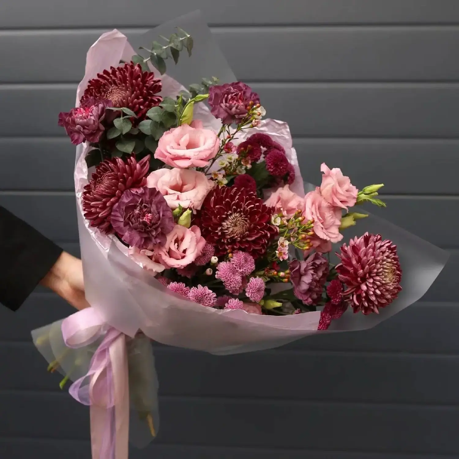 Состав: Хризантема, Диантус, Эустома, Шамелациум