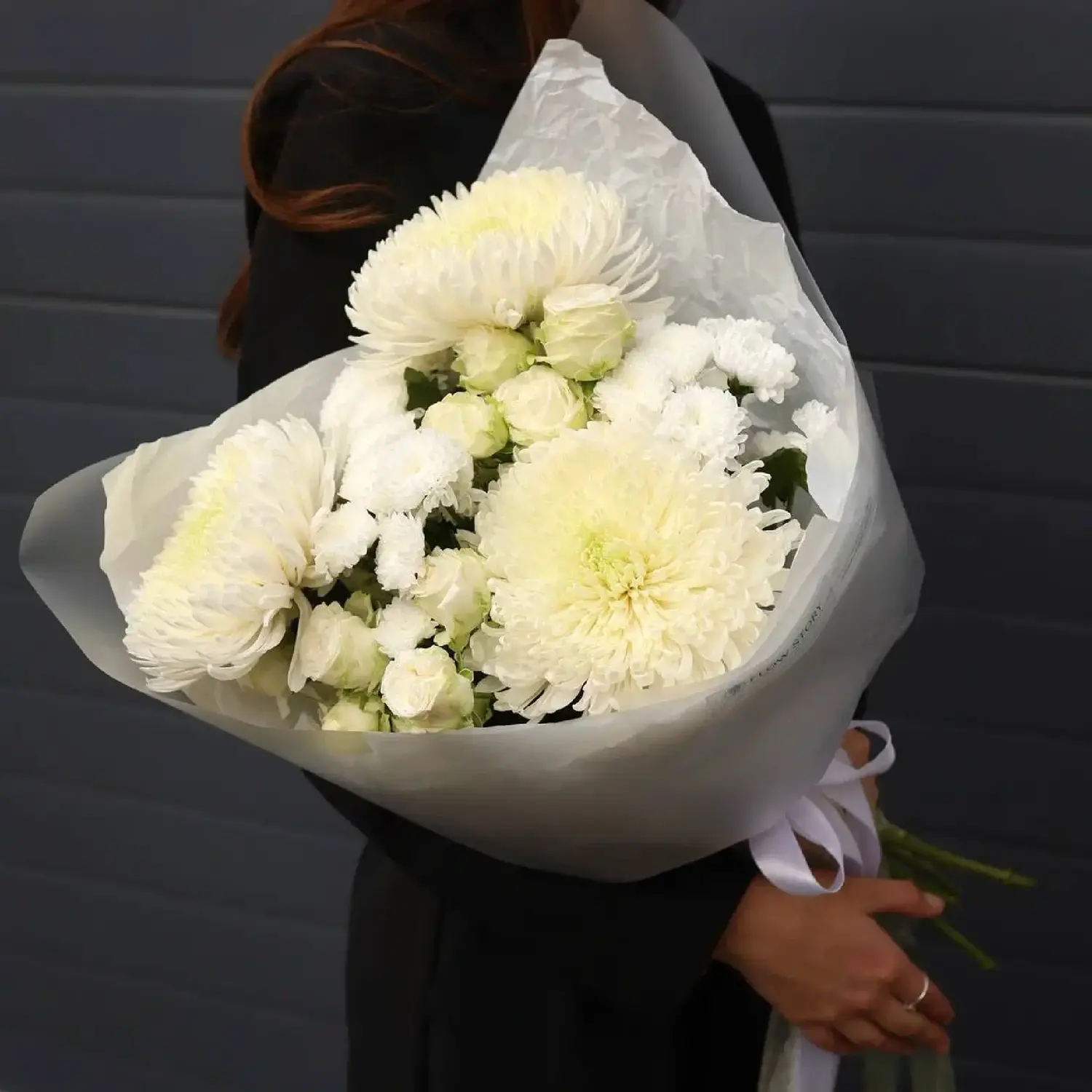 Букет в белых оттенках из одноголовой хризантемы, кустовой розы и сантини