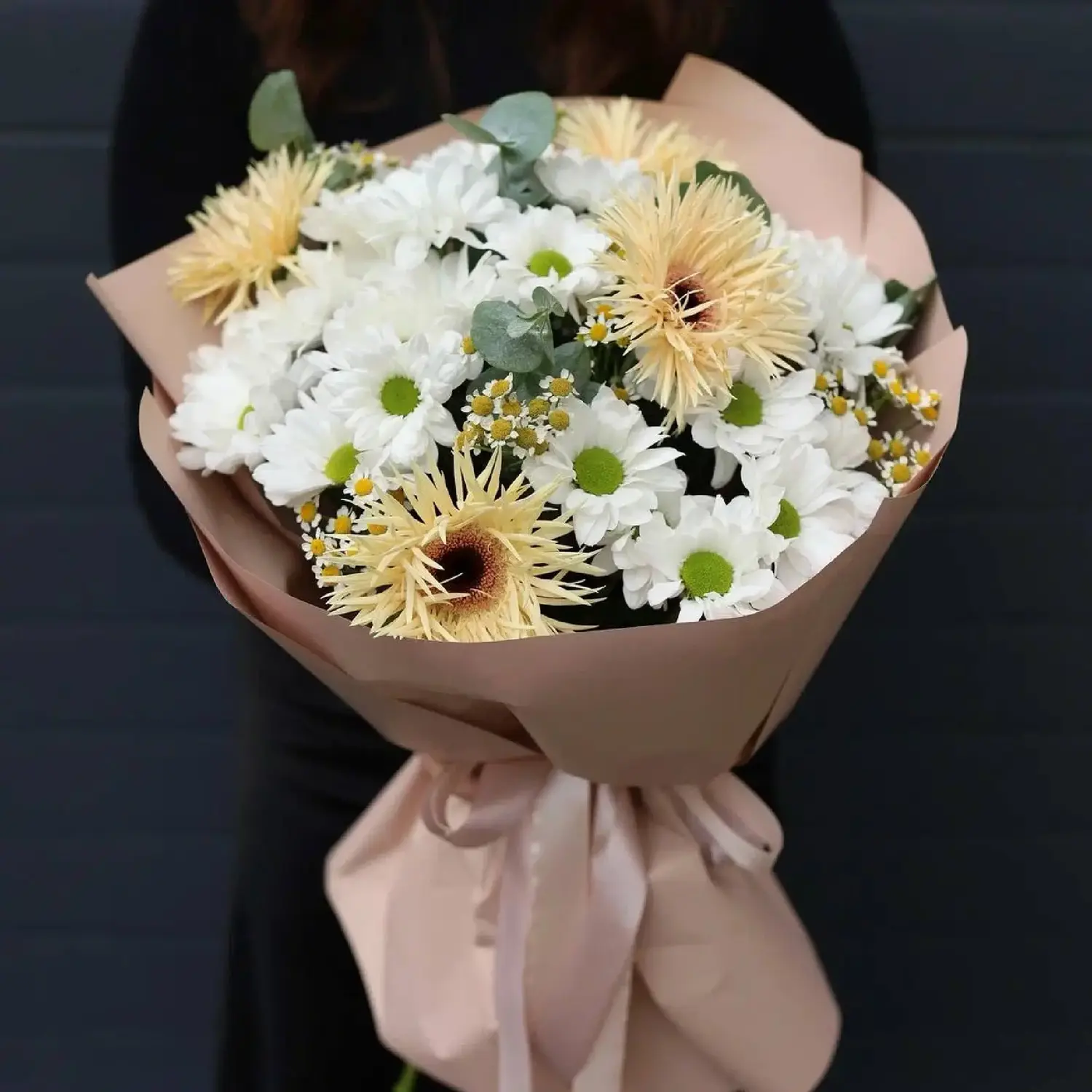 Авторский букет из гербер, ромашковой хризантемы и ромашки