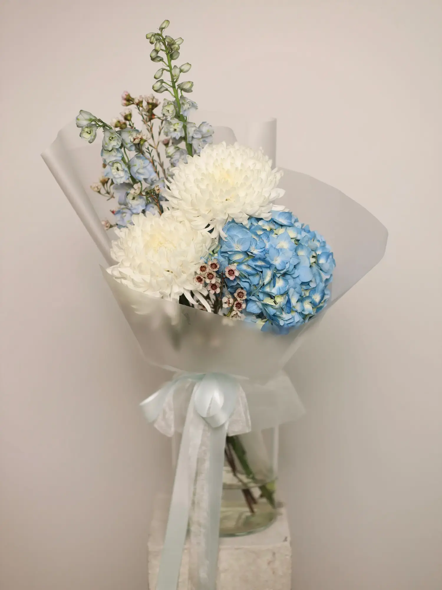 Букет в бело-голубых оттенках из одноголовой хризантемы, гортензии и дельфиниума