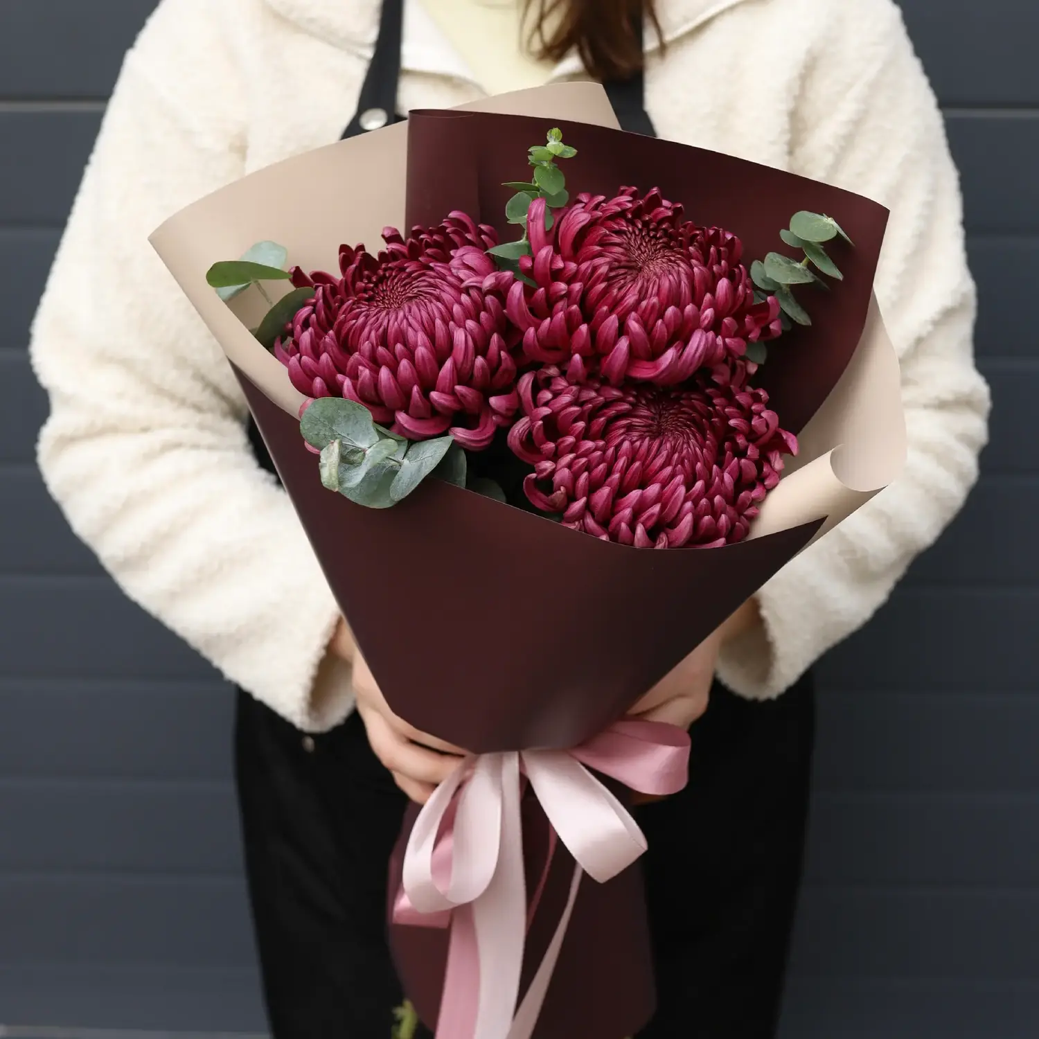 Яркий букет из хризантем сорта бигуди и ароматного эвкалипта