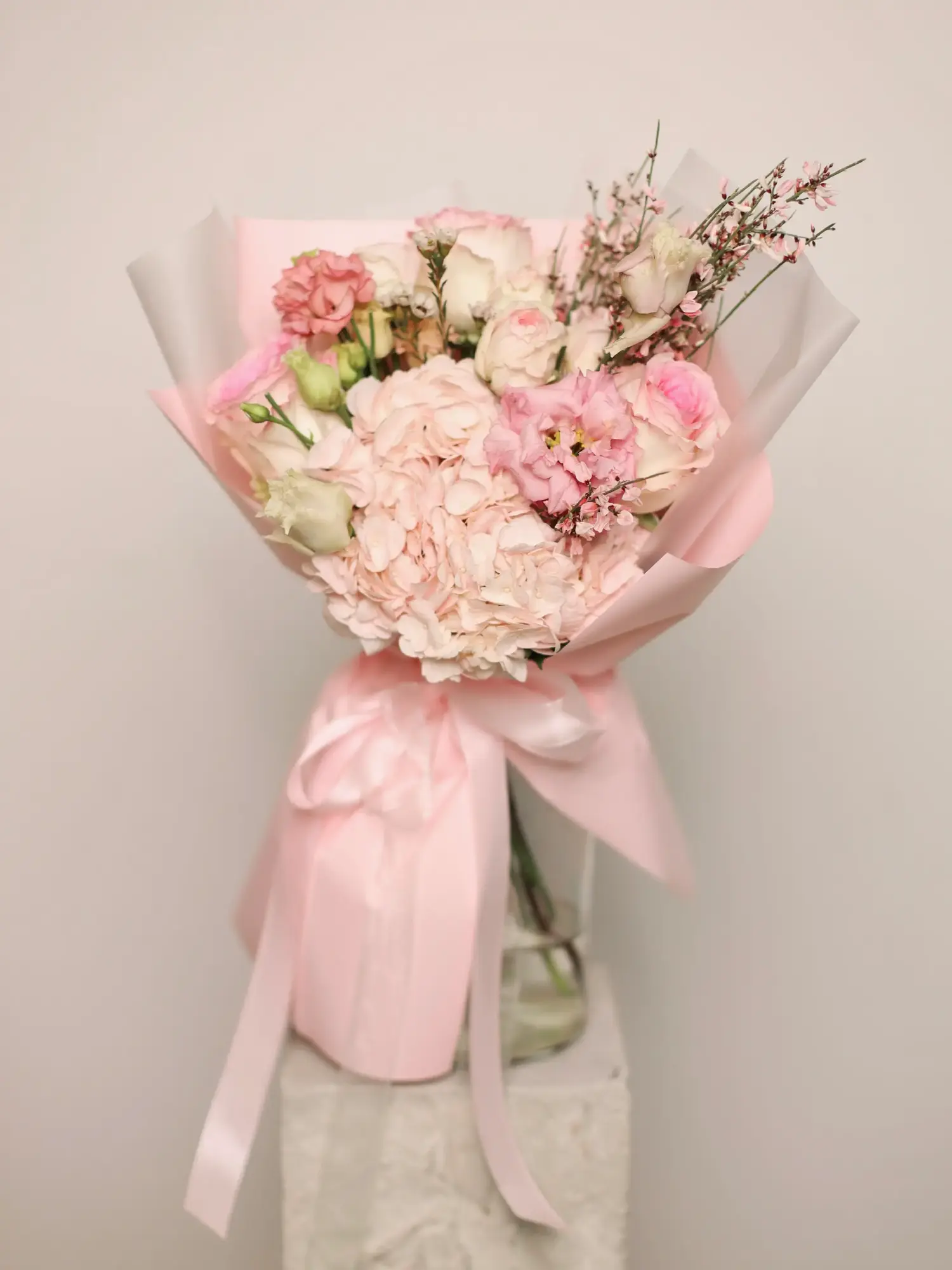 Букет в розовых оттенках из гортензии, кустовой розы, одноголовой розы и эустомы