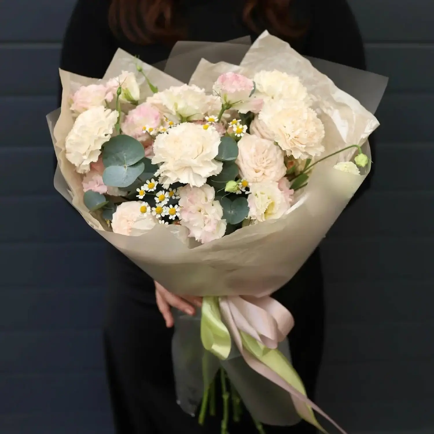 Авторский букет в бежевых оттенках из диантусов, кустовой розы, эустомы и ромашки