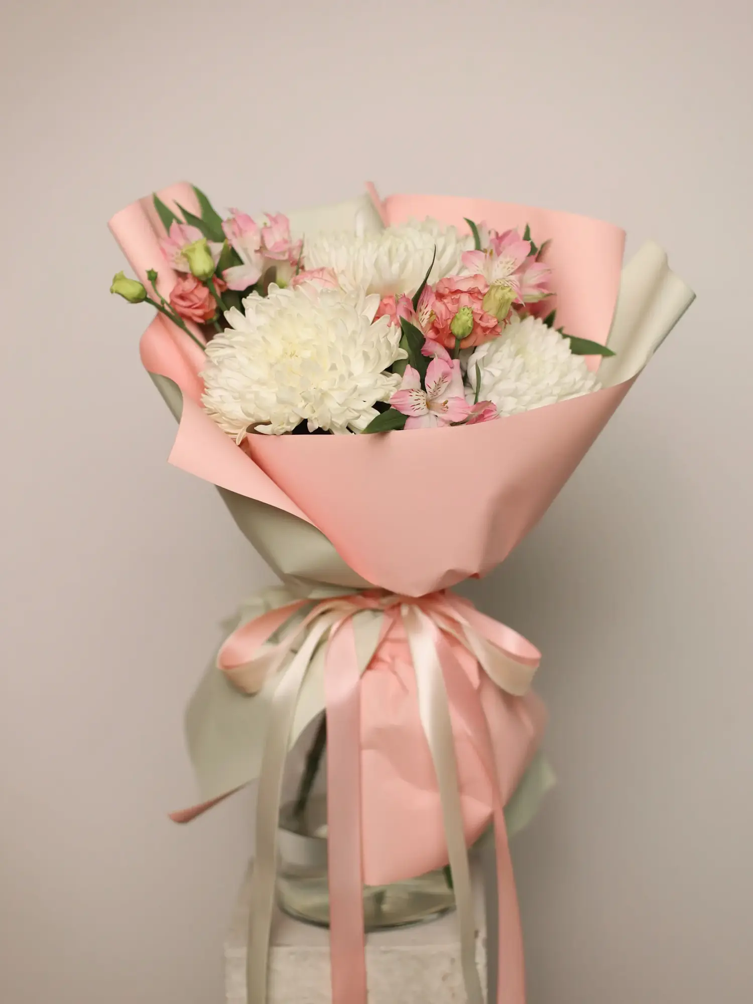 Букет в бело-розовых оттенках из одноголовой хризантемы, альстромерии и эустомы