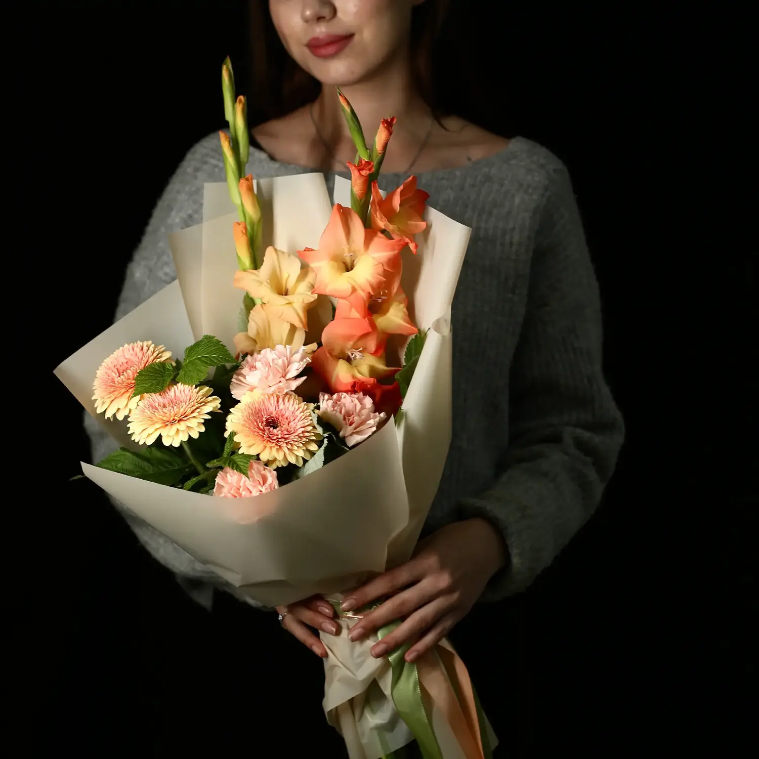 Состав: Гербера, Диантус, Гладиолус, Зелень