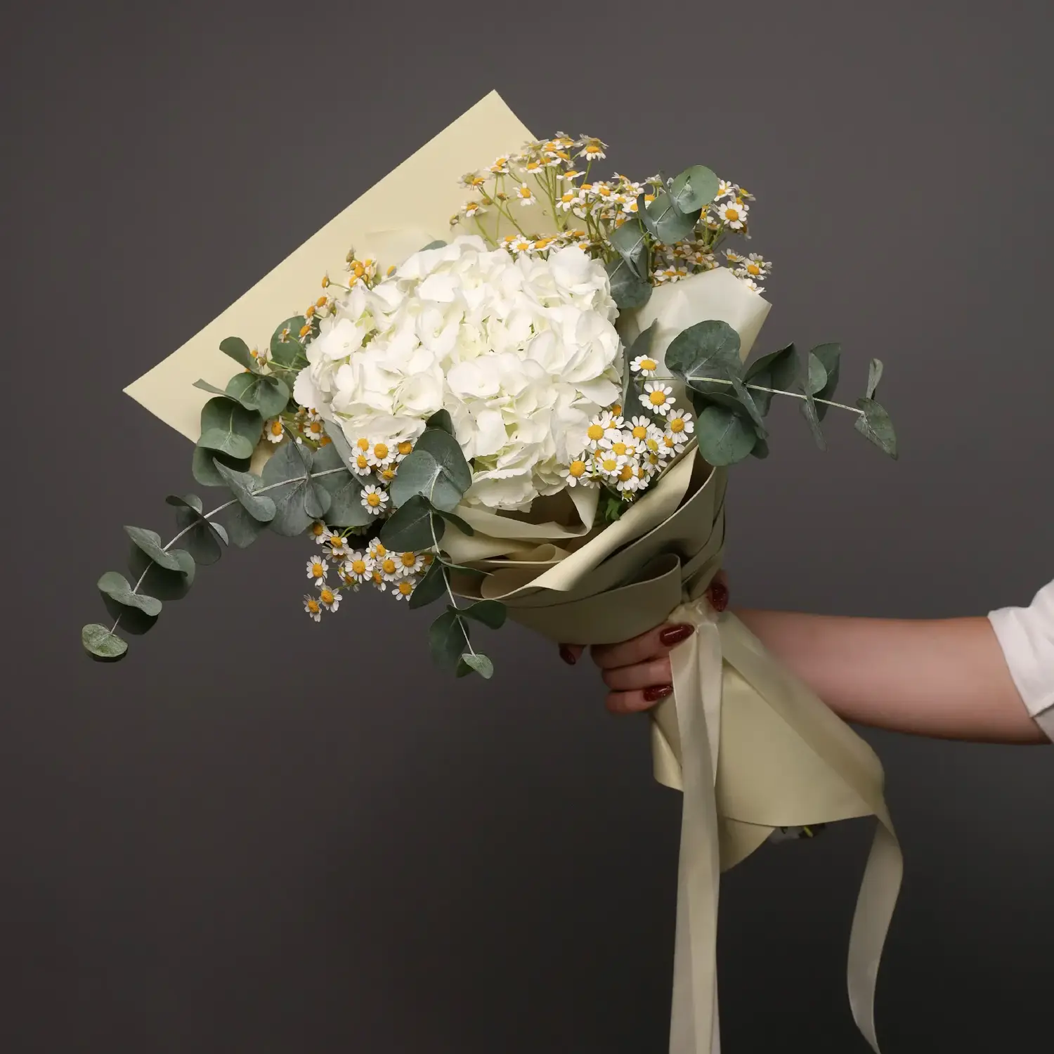 Миниатюрный букет из белой гортензии и ромашки с добавлением ароматного эвкалипта