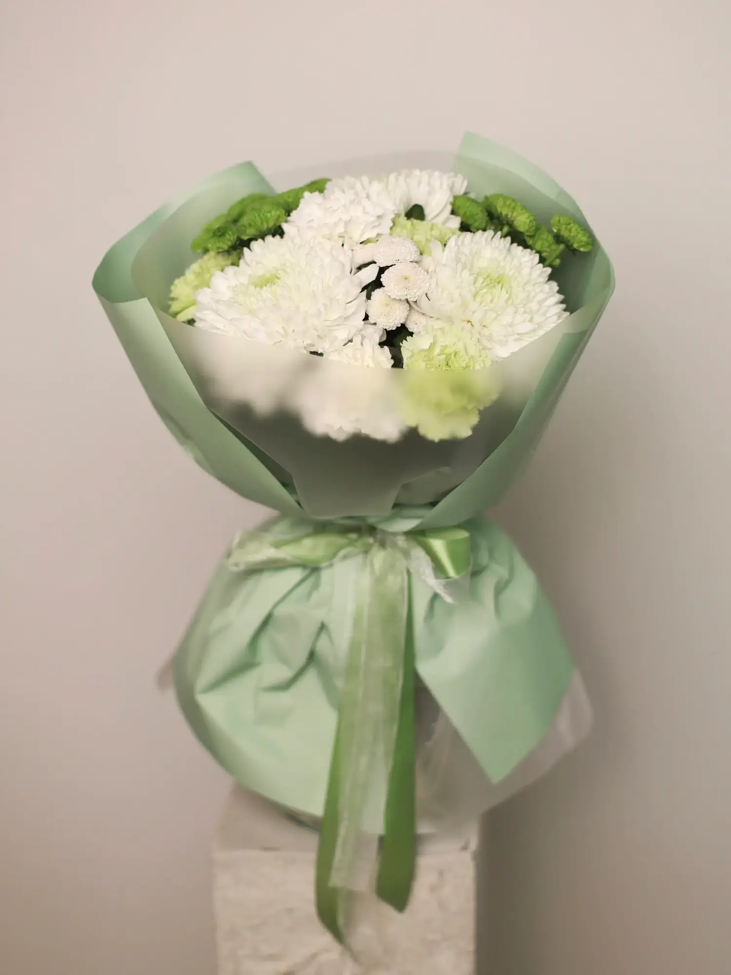 Букет в бело-зеленых оттенках из одноголовой хризантемы, сантини и диантусов