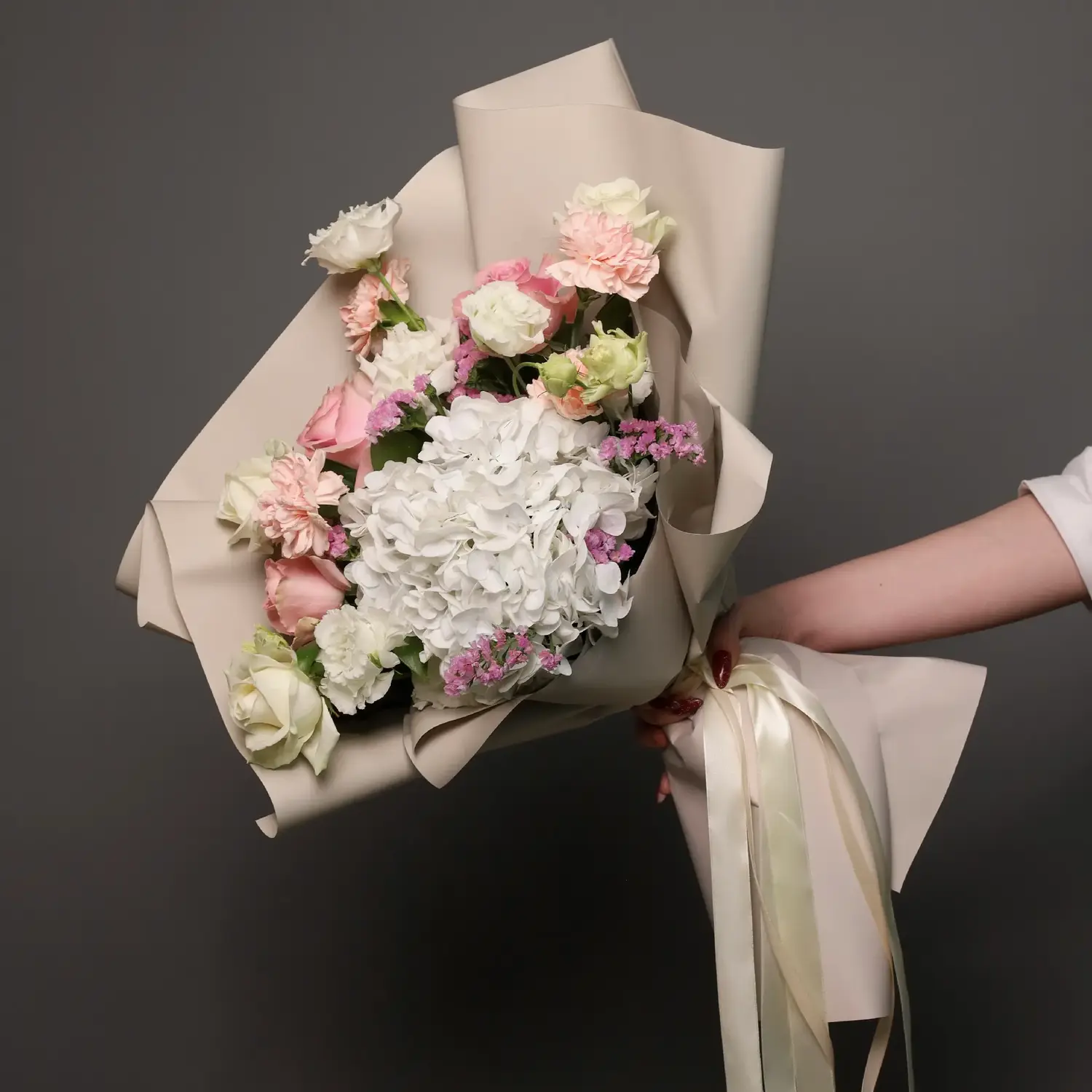 Состав: Роза, Диантус, Эустома, Гортензия, Статица