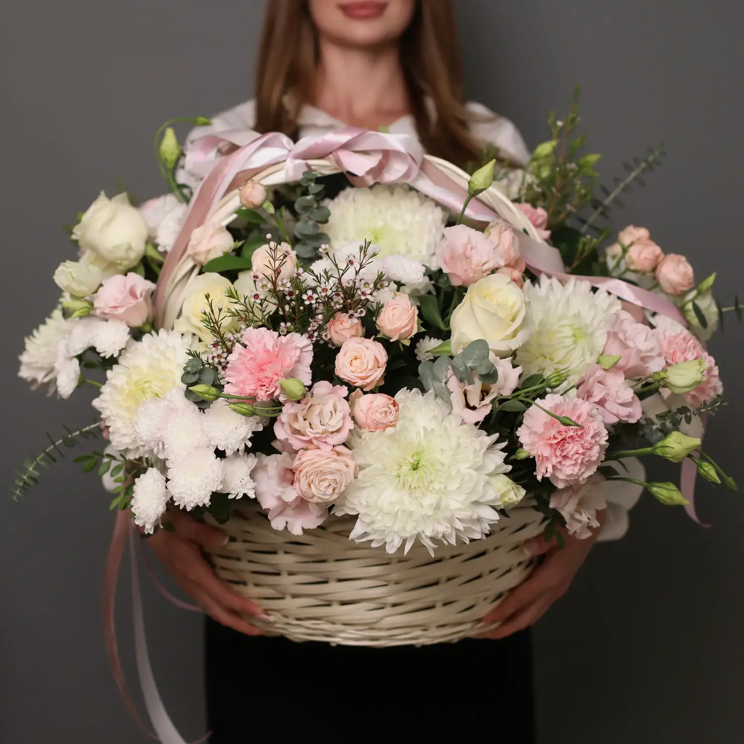 Корзина в бело-розовых оттенках из одноголовой хризантемы, кустовой розы, сантини и шамелациума