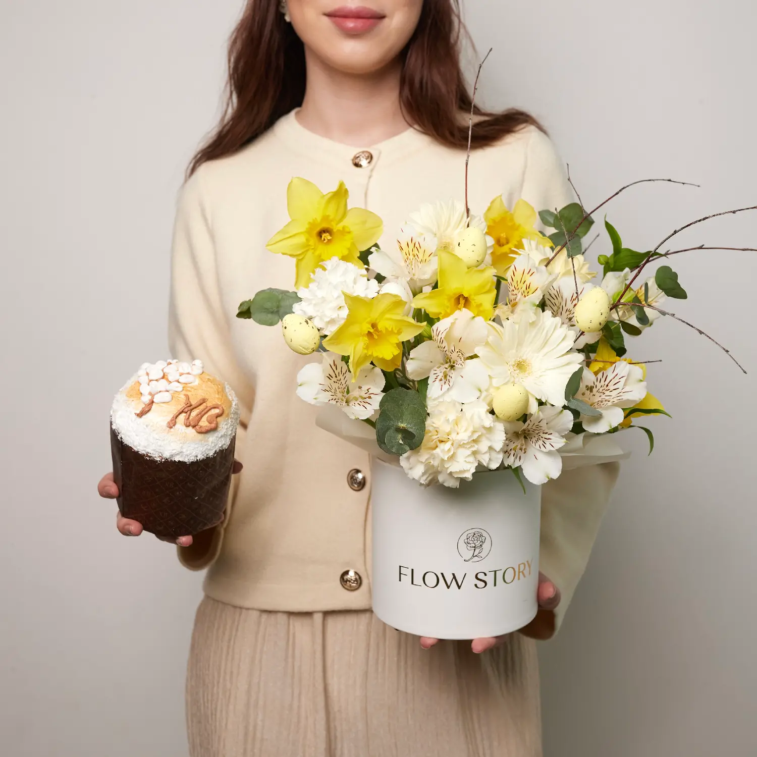 "Подарочный набор из воздушного кулича от кондитерской "Малина" и любого букета из нашего цветочного каталога на ваш выбор С ассортиментом куличей можете ознакомиться на картинках в карточке товара Стоимость доставки может увеличиться, в зависимости от удаленности от салона живых цветов Flow Story Солнечный Конечная стоимость зависит от выбора кулича и букета Уточняйте подробности у наших менеджеров