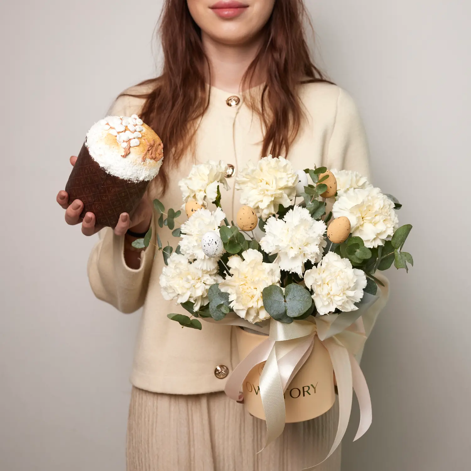 "Подарочный набор из воздушного кулича от кондитерской "Малина" и любого букета из нашего цветочного каталога на ваш выбор С ассортиментом куличей можете ознакомиться на картинках в карточке товара Стоимость доставки может увеличиться, в зависимости от удаленности от салона живых цветов Flow Story Солнечный Конечная стоимость зависит от выбора кулича и букета Уточняйте подробности у наших менеджеров