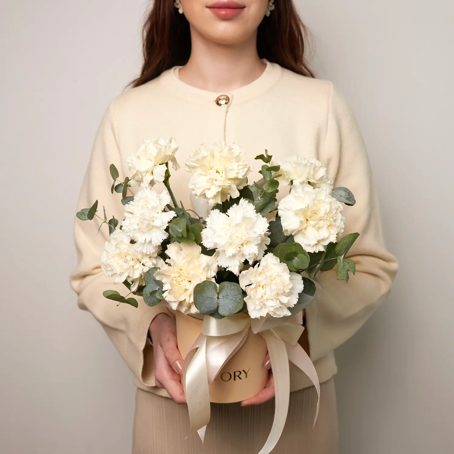 Шляпная коробка из 9-ти диантусов и ароматного эвкалипта