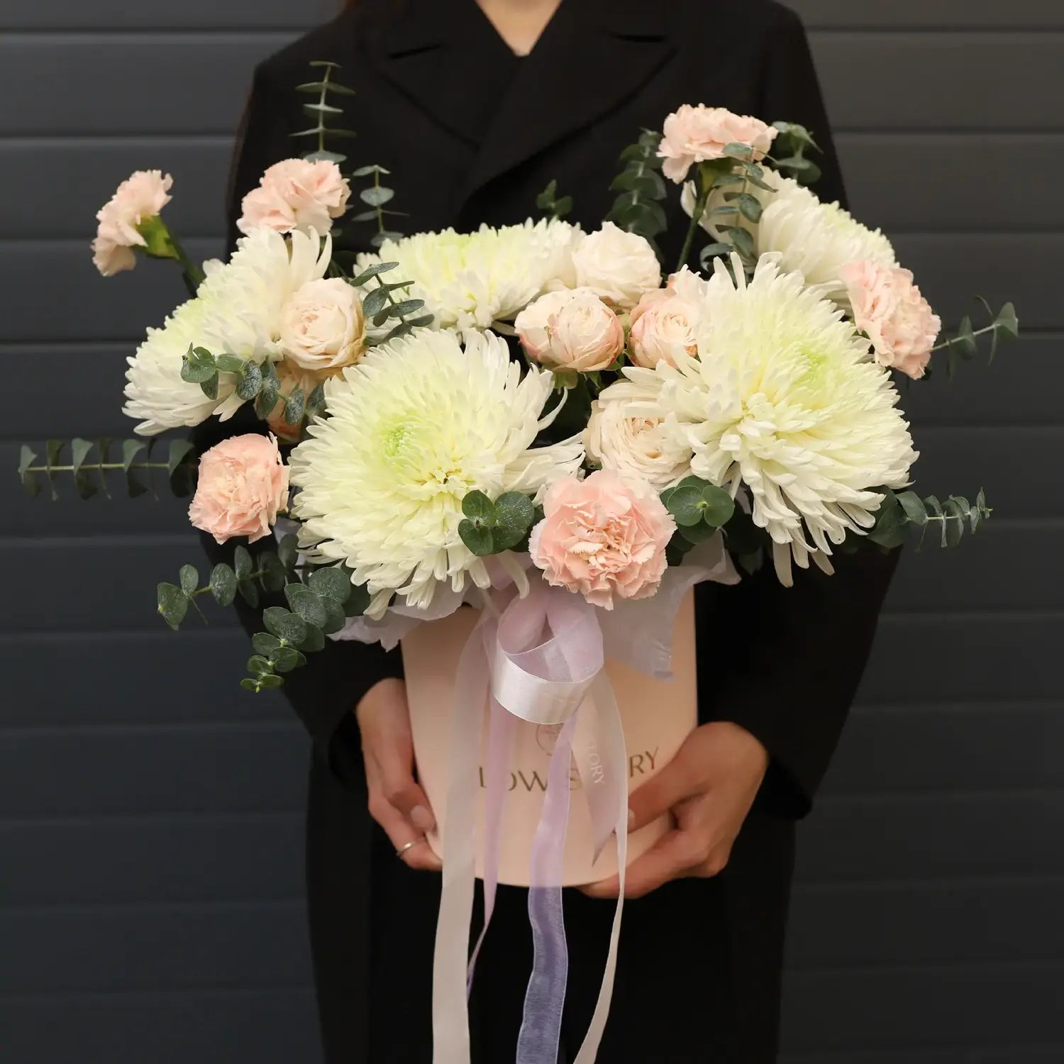 Нежная композиция в шляпной коробке из одноголовой хризантем, кустовой персиковой розы и ароматного эвкалипта