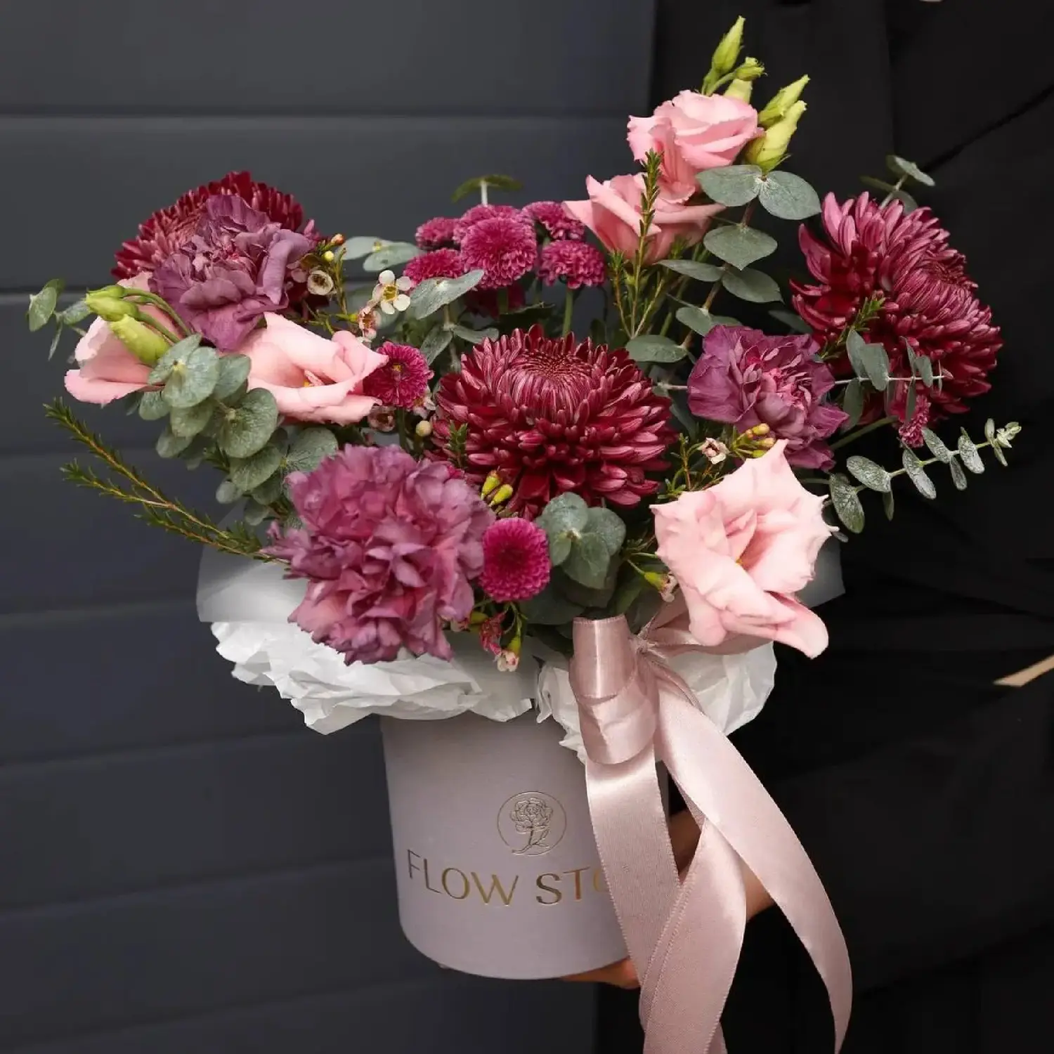 Состав: Хризантема, Диантус, Зелень, Шамелациум, Эустома