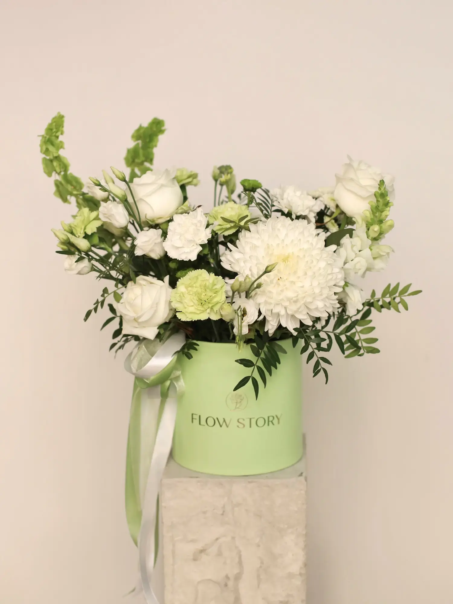 Композиция в бело-зеленых оттенках из одноголовой хризантемы, диантусов, белой розы и молюцелы