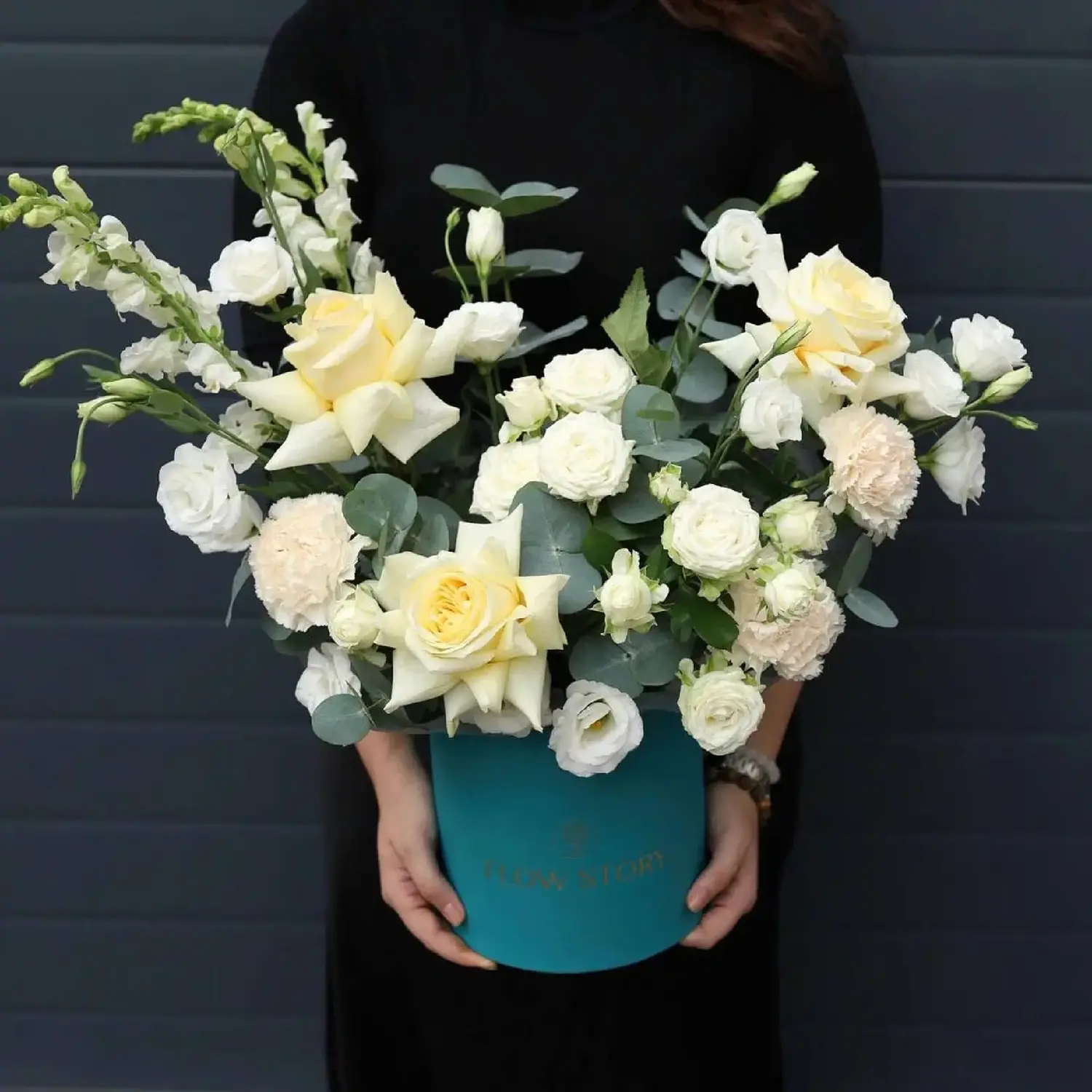 Яркая авторская композиция в бело-изумрудных оттенках из французских роз, эустомы и кустовой белой розы с добавлением ароматного эвкалипта