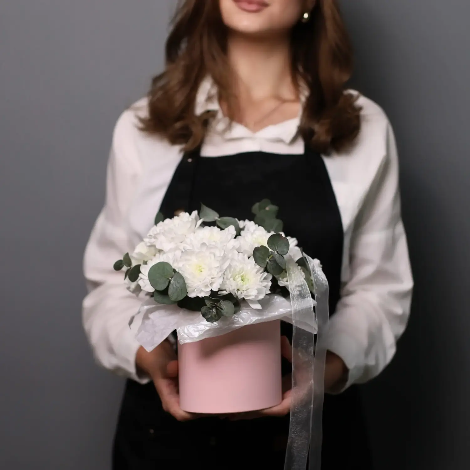 Небольшая композиция из кустовой хризантемы сорта алтай с добавлением ароматного эвкалипта