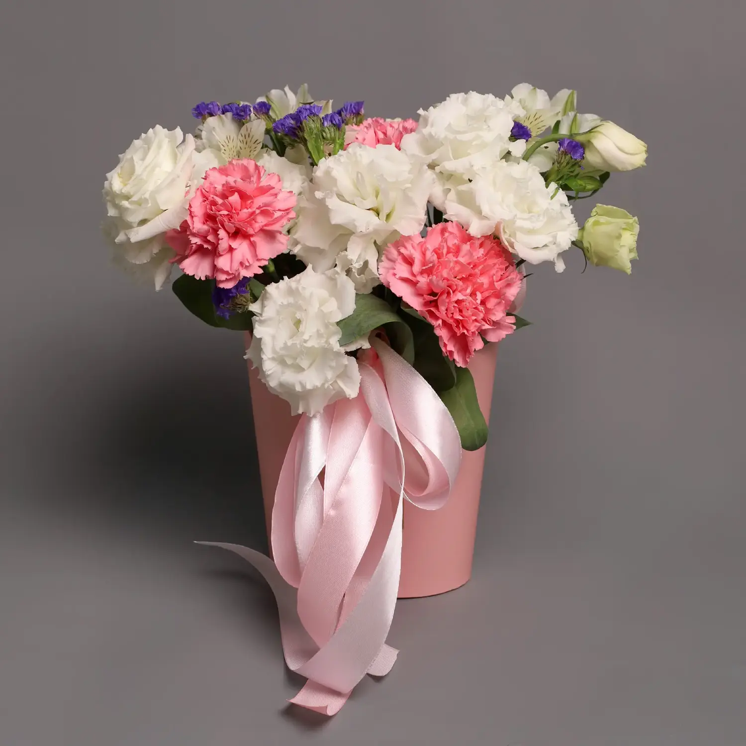 Нежная композиция в бело-розовых оттенках из диантусов, махровой эустомы и статицы