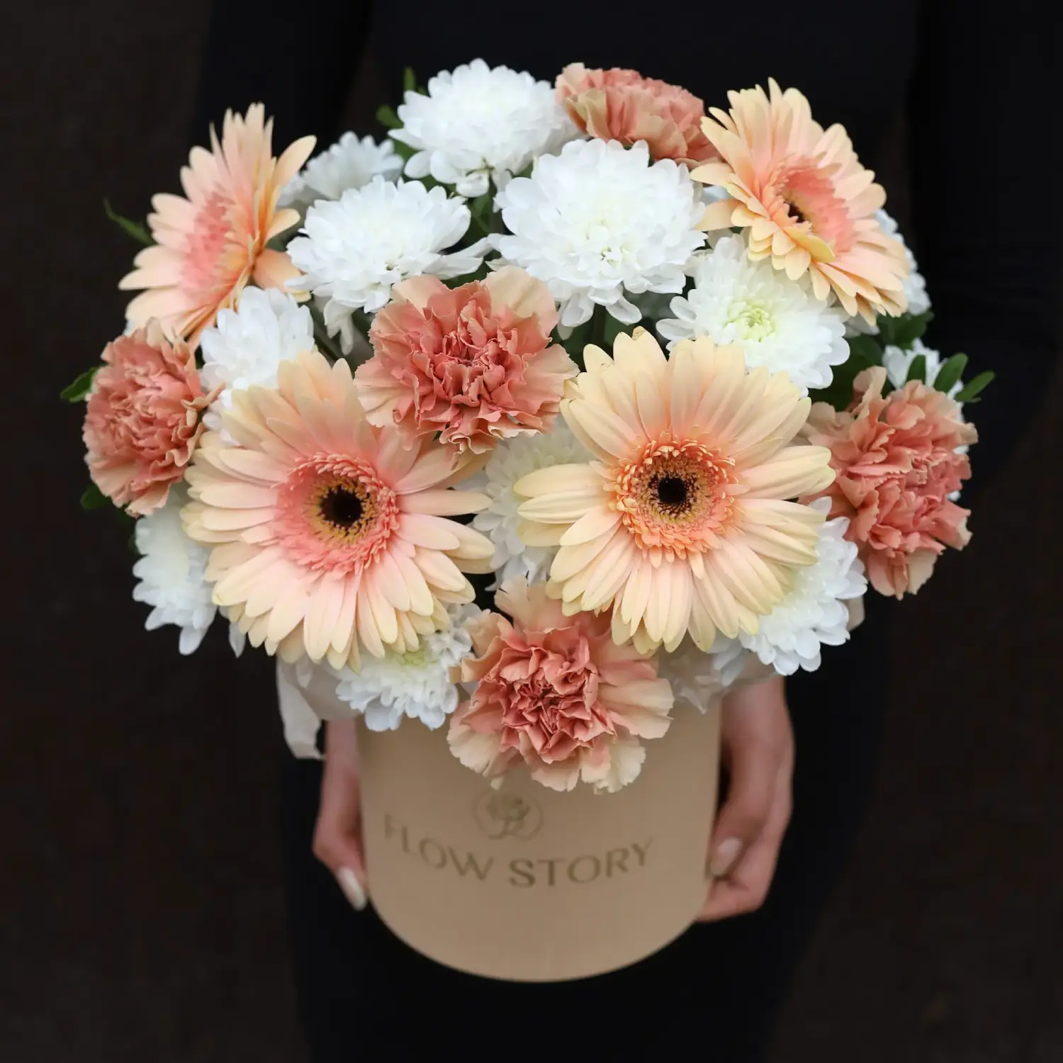 Композиция в шляпной коробке в бело-персиковых оттенках из герберы, кустовой хризантемы и диантусов