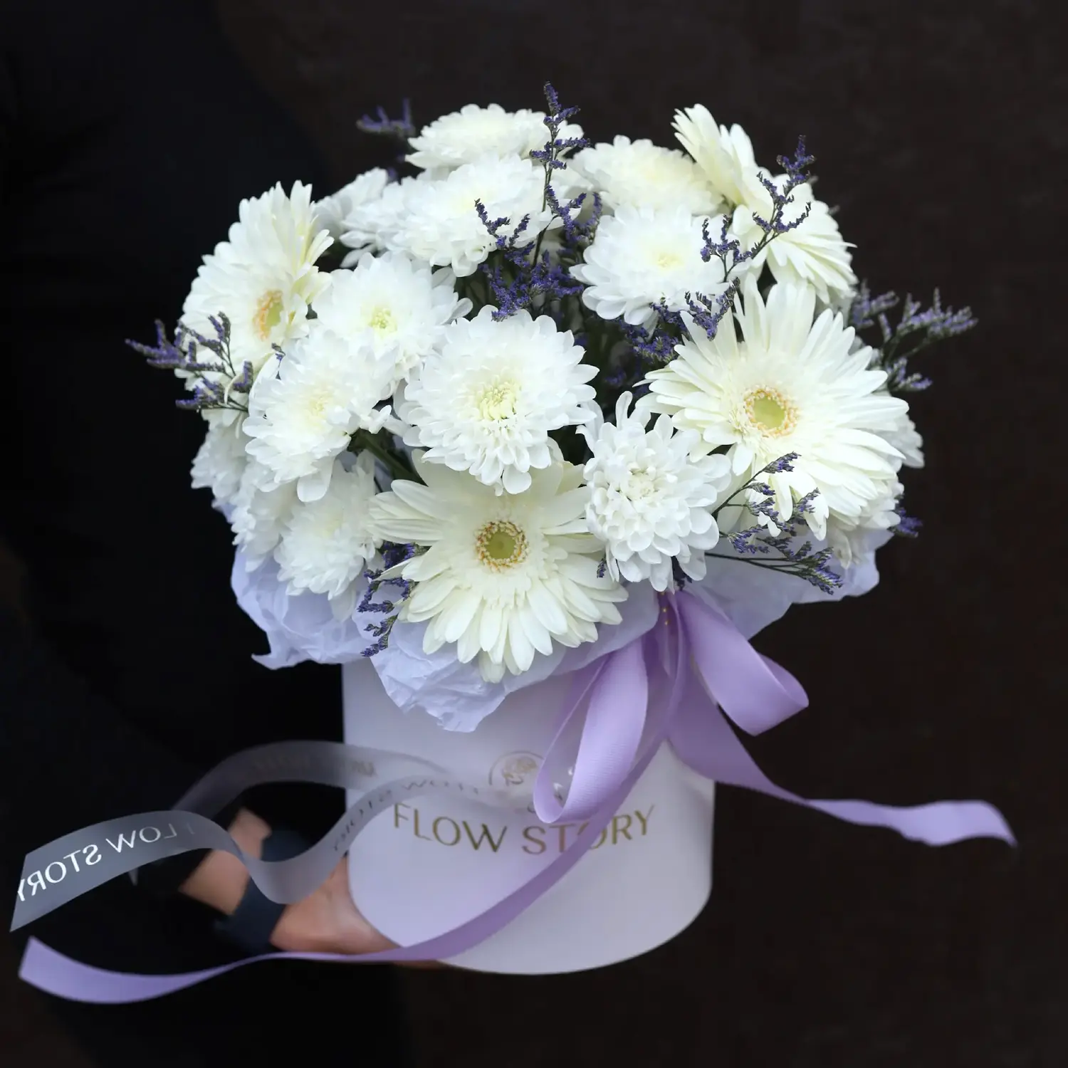 Композиция в шляпной коробке из гербер, кустовой хризантемы и лимониума
