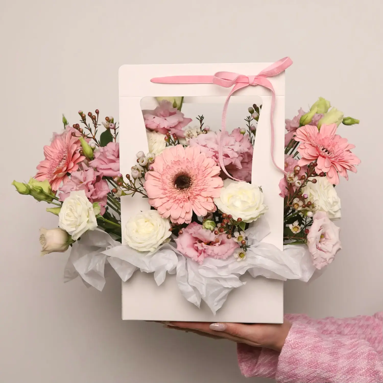 Состав: Гербера, Роза, Эустома, Зелень, Шамелациум