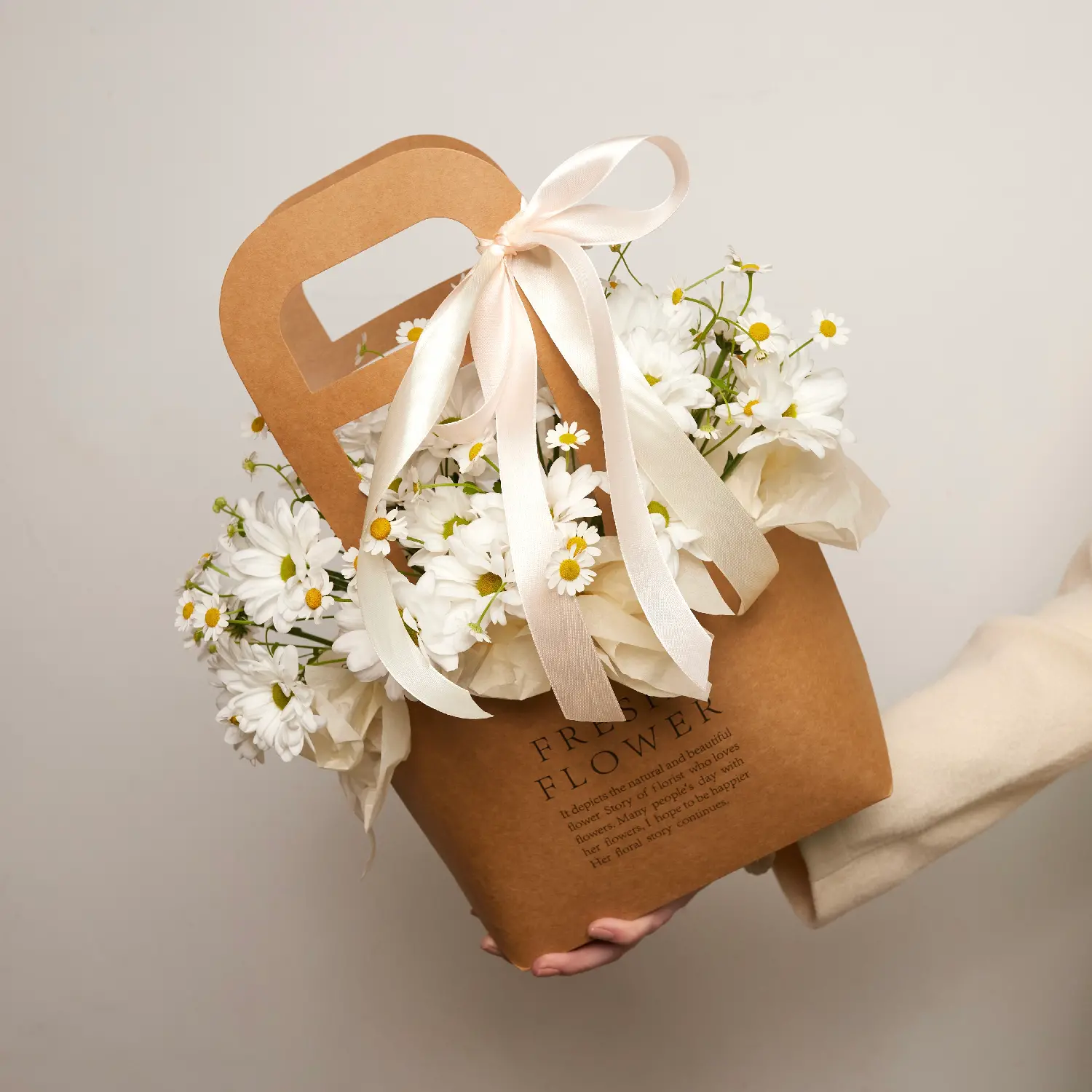 Композиция в сумочке из ромашковой хризантемы и ромашки