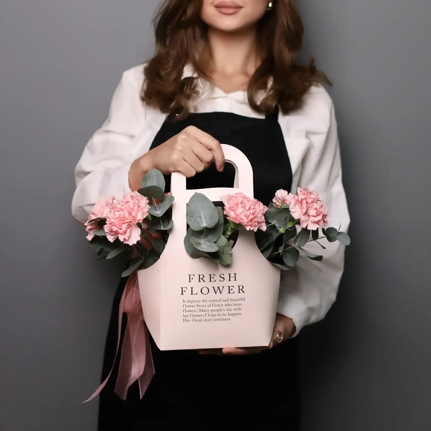 Композиция в сумочке из 9 розовых диантусов с добавлением ароматного эвкалипта