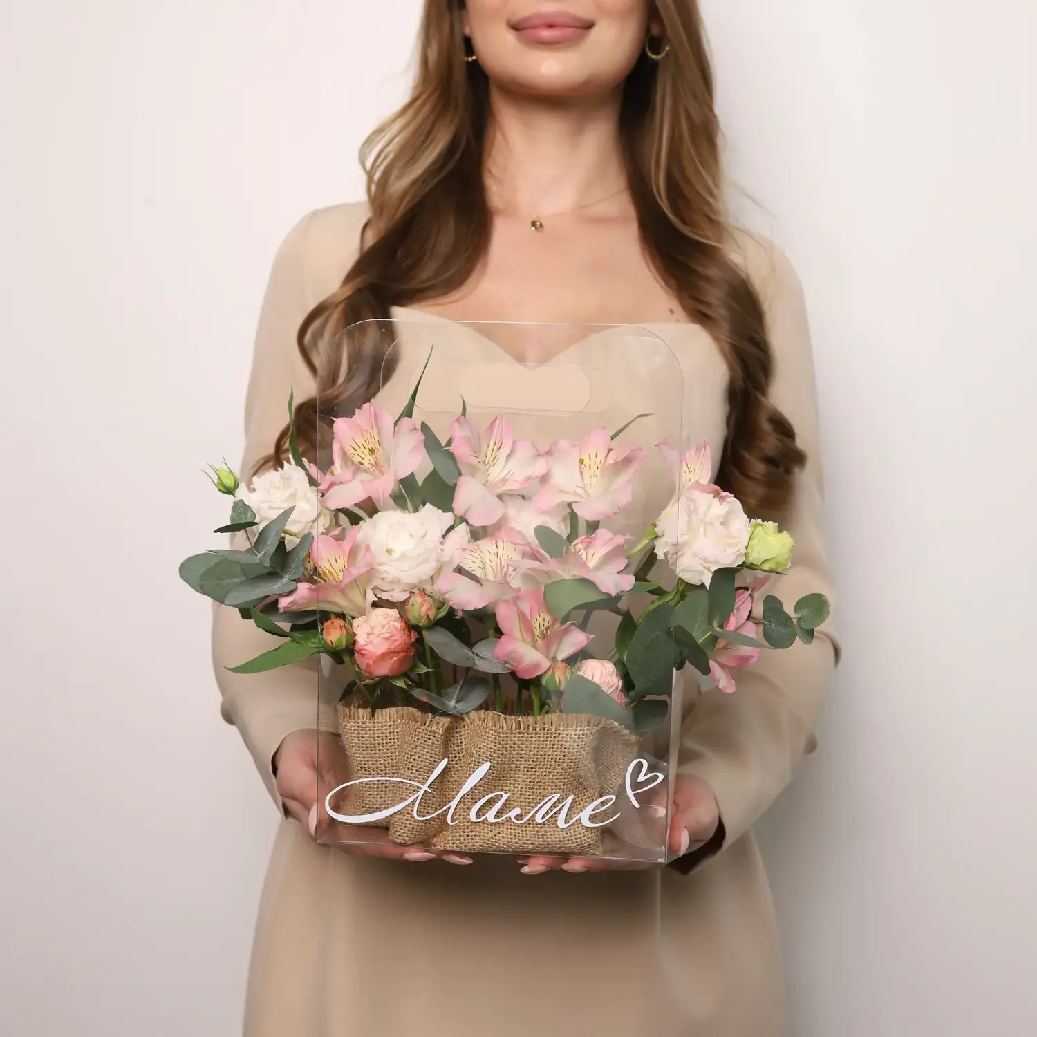 Авторская композиция в прозрачной сумке для мамы из альстромерии и эустомы